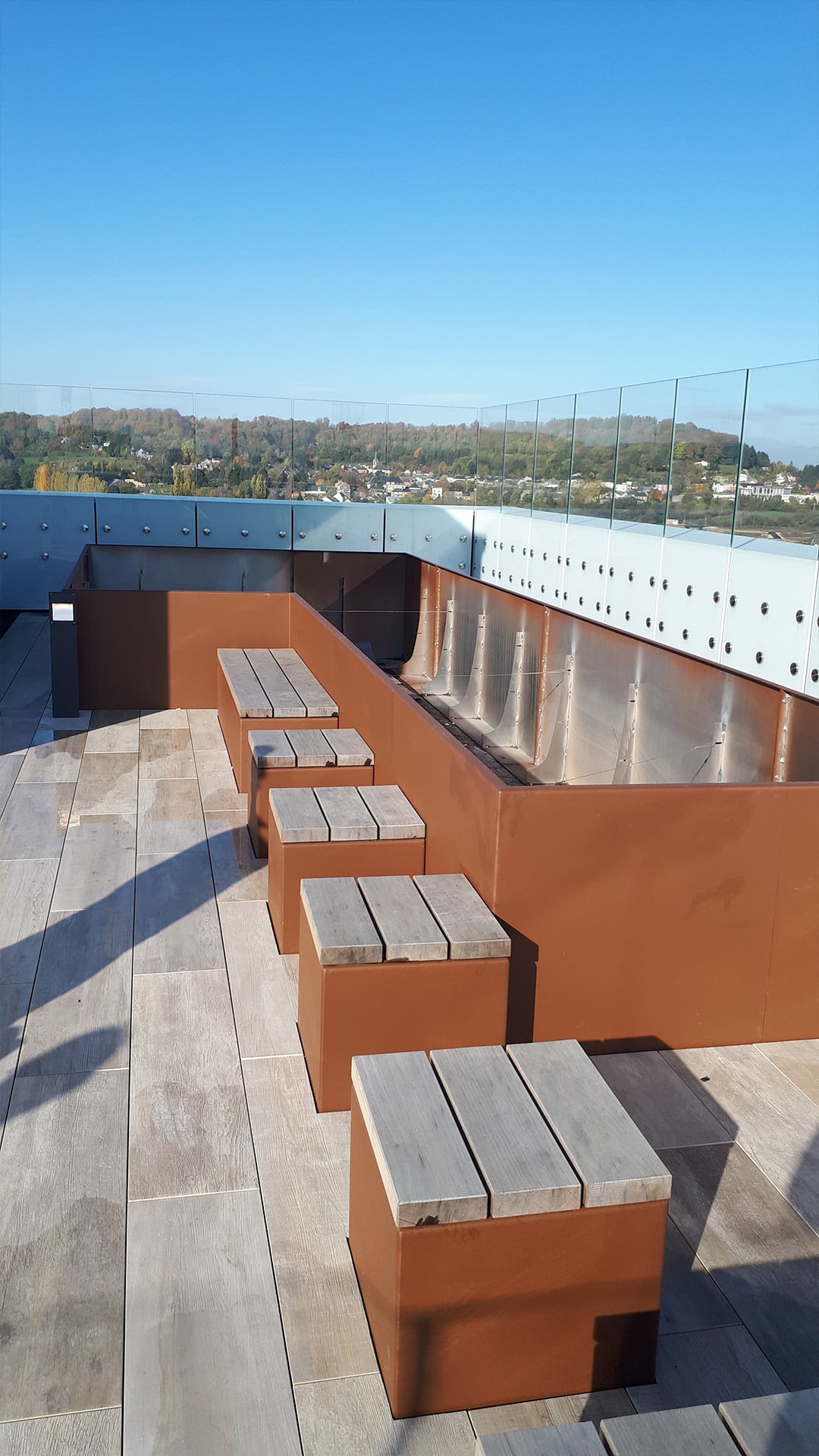 Nous avons déployé toute notre expertise en roulage, pliage et soudure afin de créer divers bacs sans fond en acier corten épaisseur 3 mm, traités par sablage, activation et stabilisation. De plus, leur conception avec renforts intérieurs et visserie non apparente assure une structure autostable et un rendu épuré. Par conséquent, ces bacs s’intègrent parfaitement dans l’esprit industriel et contemporain de Belval. En outre, certains bacs intègrent des banquettes en bois exotique FSC, offrant des espaces de détente conviviaux et répondant aux critères de durabilité.